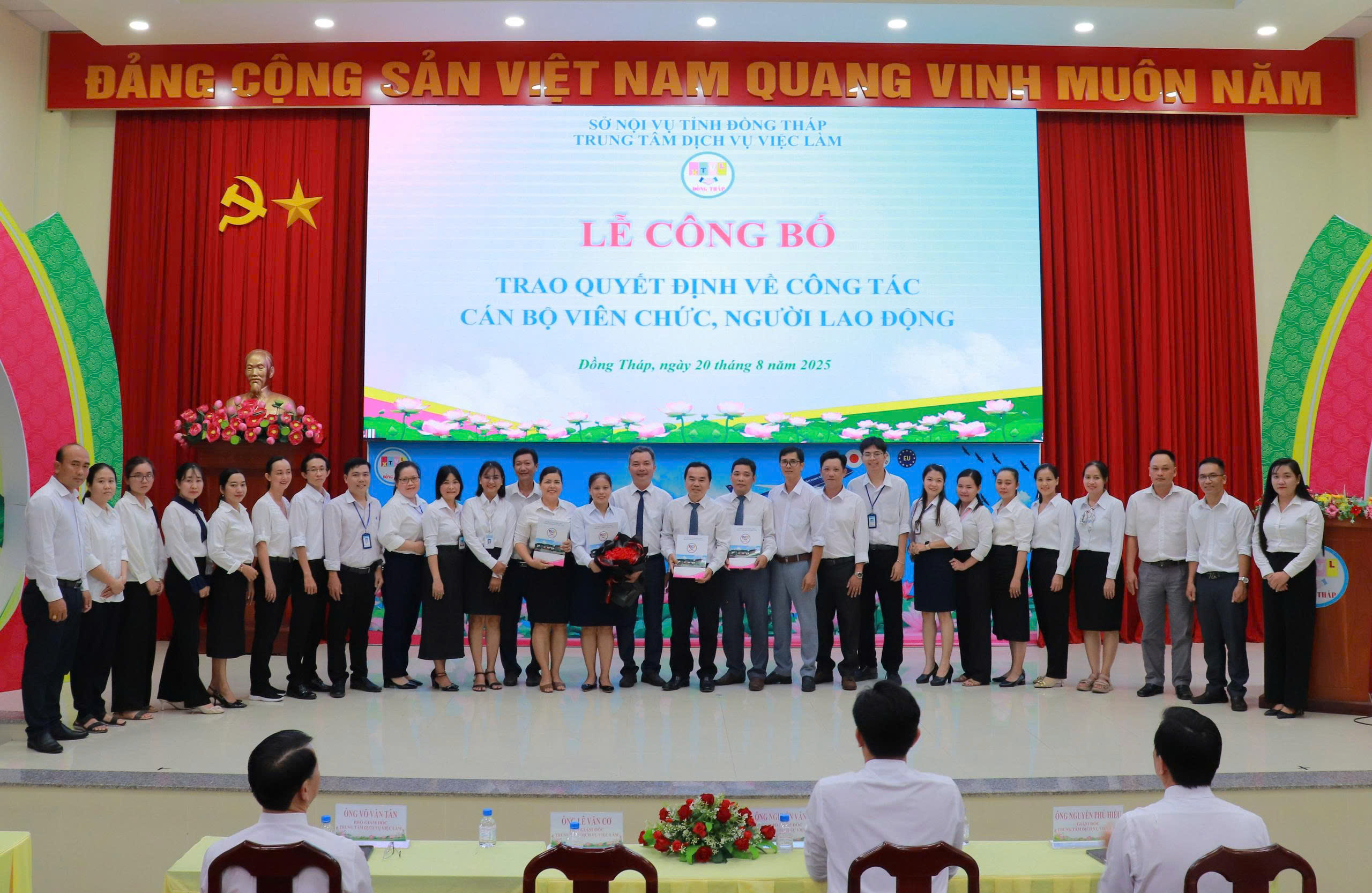 Chiều ngày 20/08/2025, Trung tâm Dịch vụ việc làm Đồng Tháp đã long trọng tổ chức Lễ công bố quyết định về công tác cán bộ, viên chức, người lao động đơn vị. Đây là sự kiện có ý nghĩa rất lớn, đánh dấu bước kiện toàn quan trọng sau khi hợp nhất hai đơn vị theo chủ trương sắp xếp, tinh gọn bộ máy, nâng cao hiệu lực, hiệu quả hoạt động.