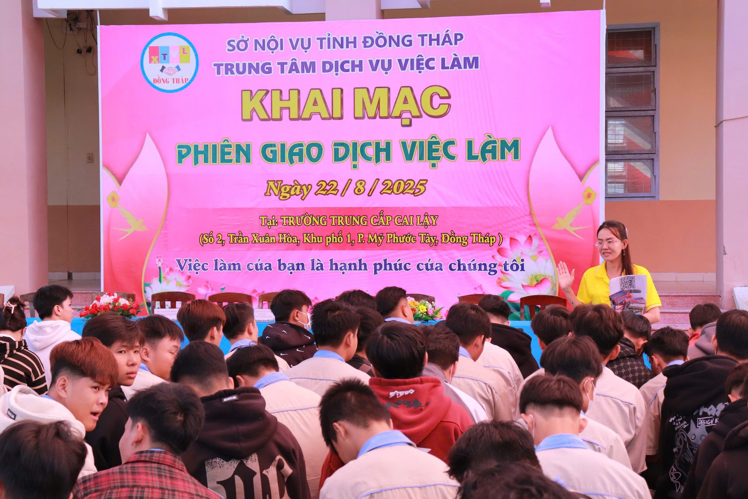 Hơn 310 lao động đã có mặt tại Trường Trung cấp Cai Lậy sáng 22/8/2025 để tìm kiếm cơ hội việc làm, học nghề và xuất khẩu lao động trong phiên giao dịch do Trung tâm Dịch vụ việc làm Đồng Tháp phối hợp cùng UBND phường Mỹ Phước Tây và Trường Trung cấp Cai Lậy tổ chức.