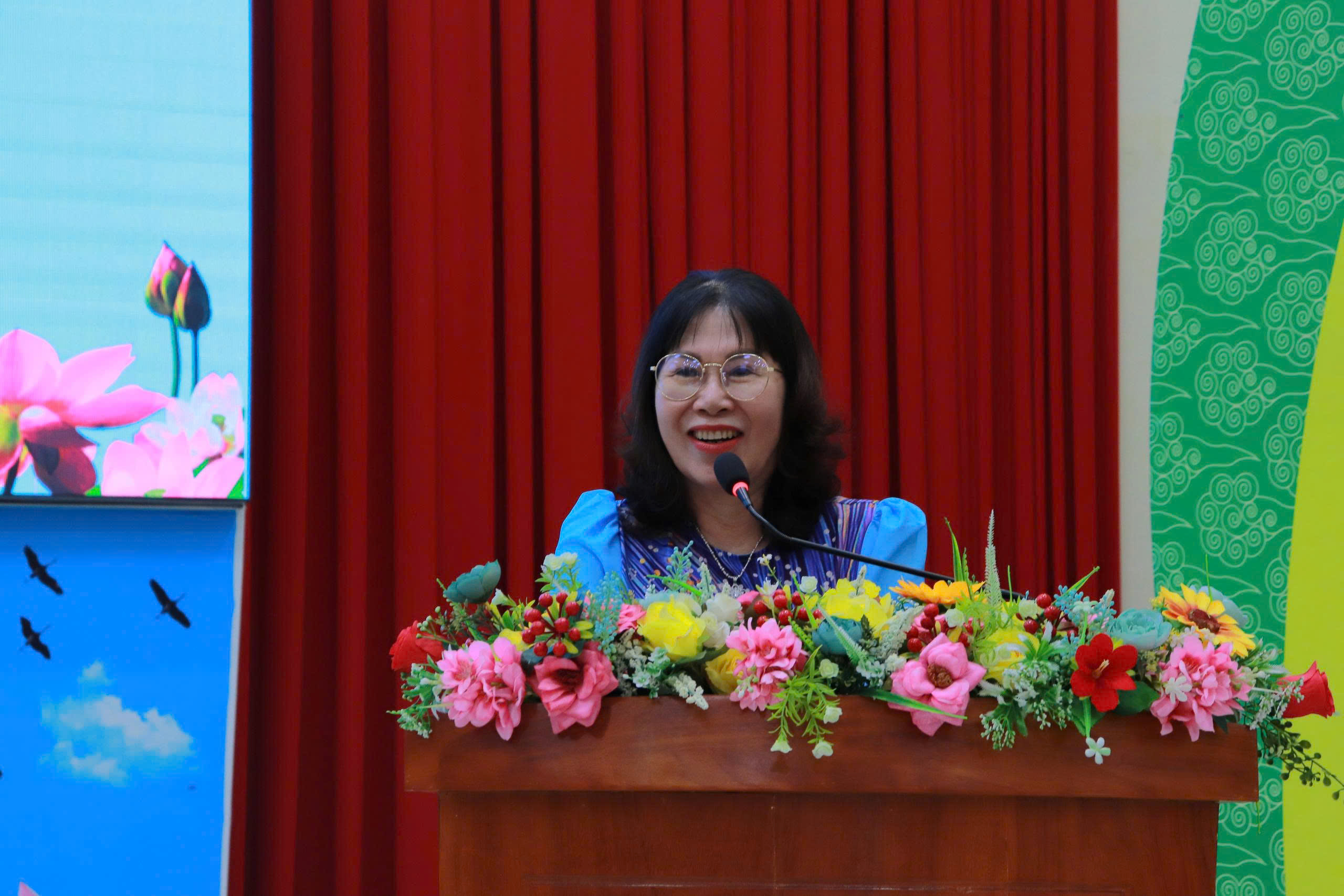 Bà Nguyễn Thị Dân Quyền – Phó Hiệu trưởng Trường Trung cấp Công nghệ và Du lịch phát biểu tại Buổi Lễ bế giảng