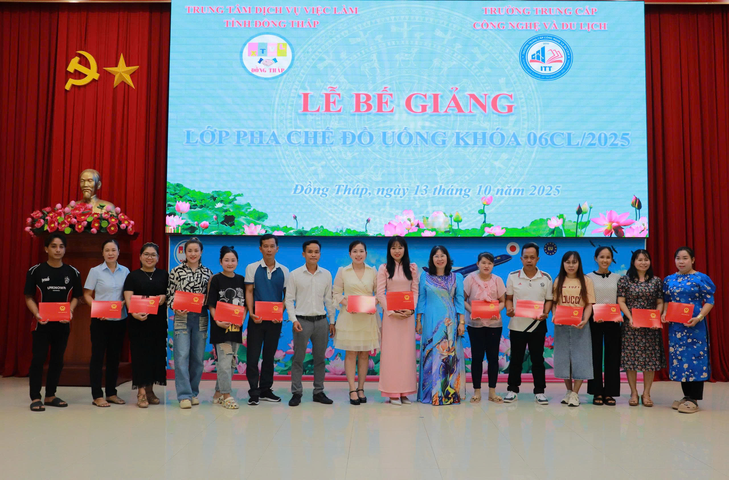 Song song với hoạt động giao dịch việc làm, Trung tâm phối hợp với Trường Trung cấp Công nghệ và Du lịch tổ chức Lễ bế giảng lớp Pha chế đồ uống 06/CL2025 cho 32 học viên. Tham dự buổi lễ có ông Nguyễn Phú Hiếu – Giám đốc Trung tâm, bà Nguyễn Thị Dân Quyền – Phó Hiệu trưởng Trường Trung cấp Công nghệ và Du lịch, lãnh đạo các phòng chuyên môn, giáo viên và toàn thể học viên.