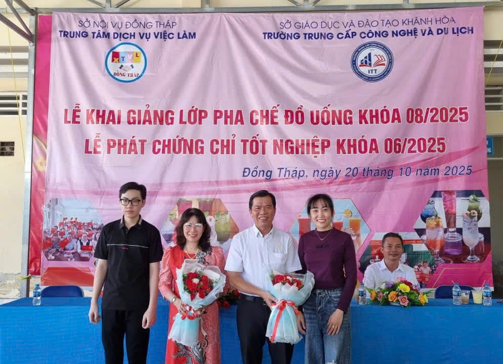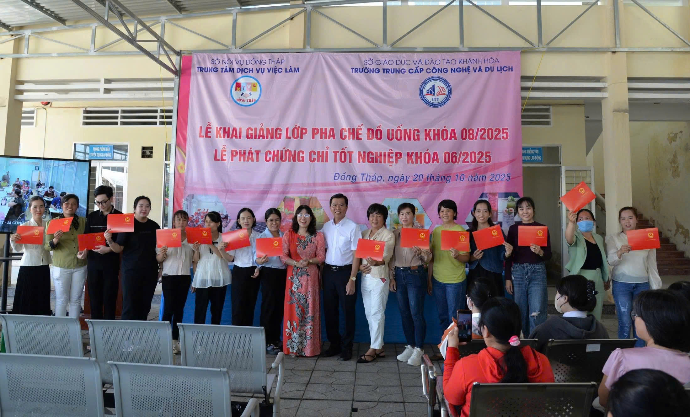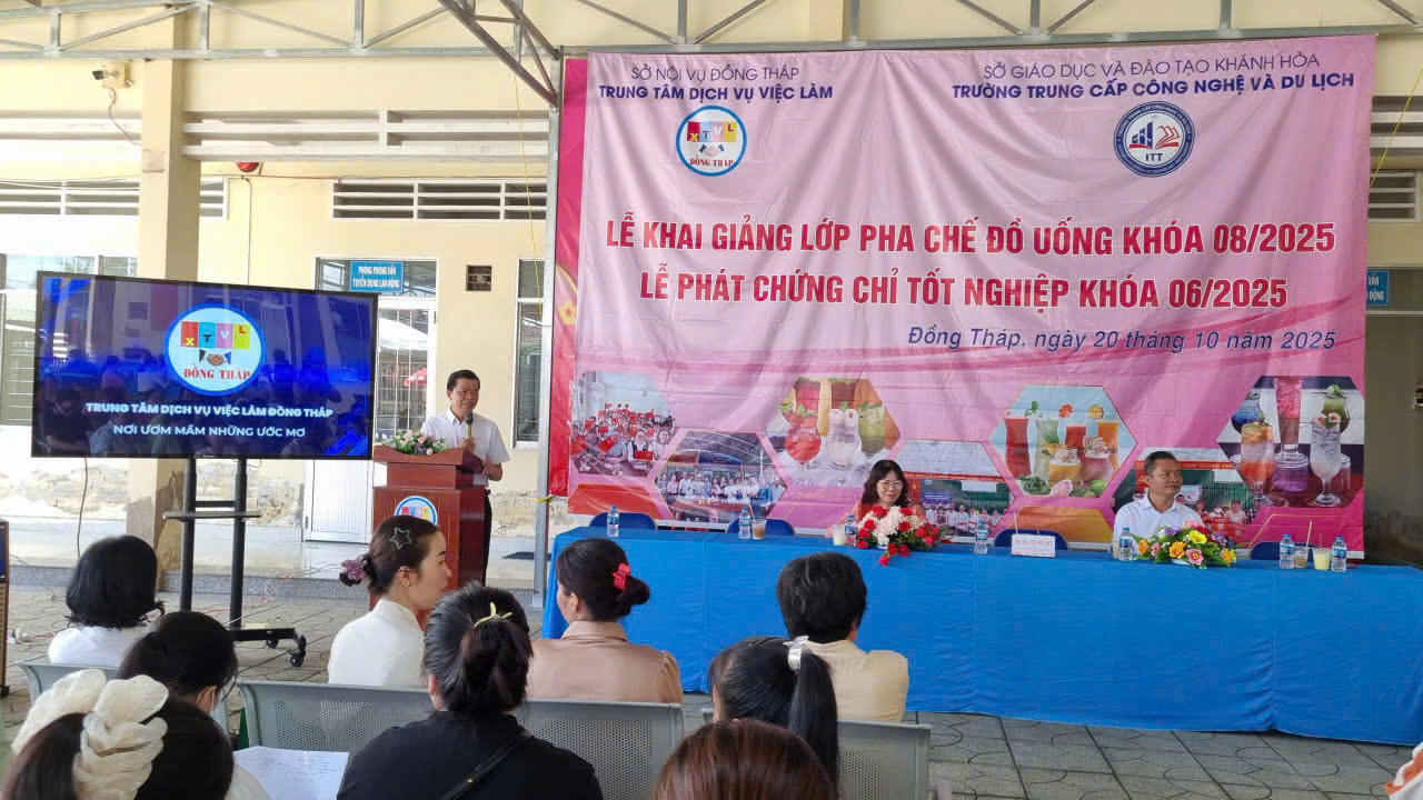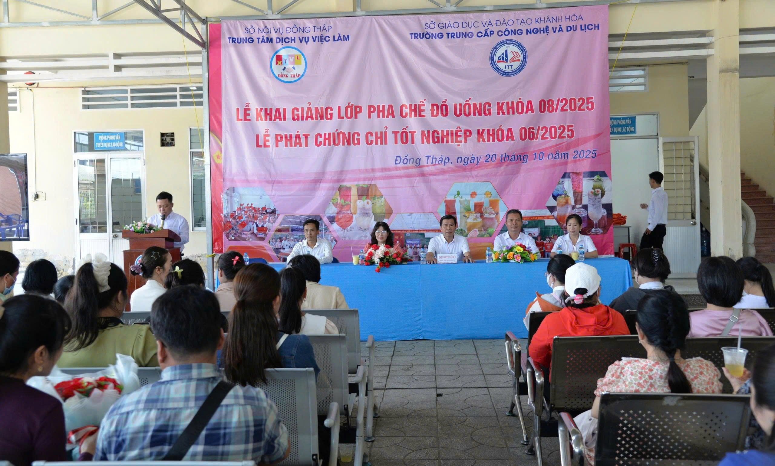 Sáng ngày 20/10/2025, Trung tâm Dịch vụ việc làm Đồng Tháp phối hợp với Trường Trung cấp Công nghệ và Du lịch tổ chức khai giảng lớp pha chế đồ uống khóa 8/2025 và phát chứng chỉ tốt nghiệp cho học viên khóa 6/2025 tại trụ sở số 04 Phạm Hùng, phường Trung An.