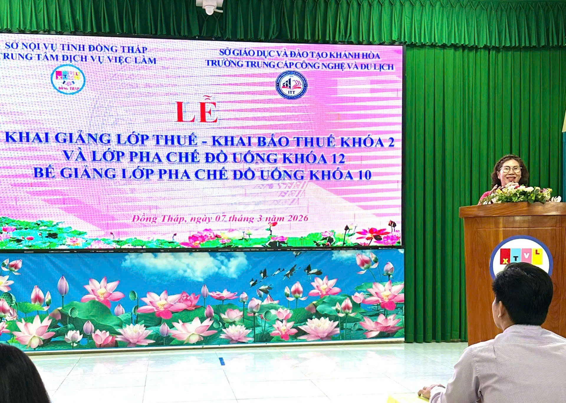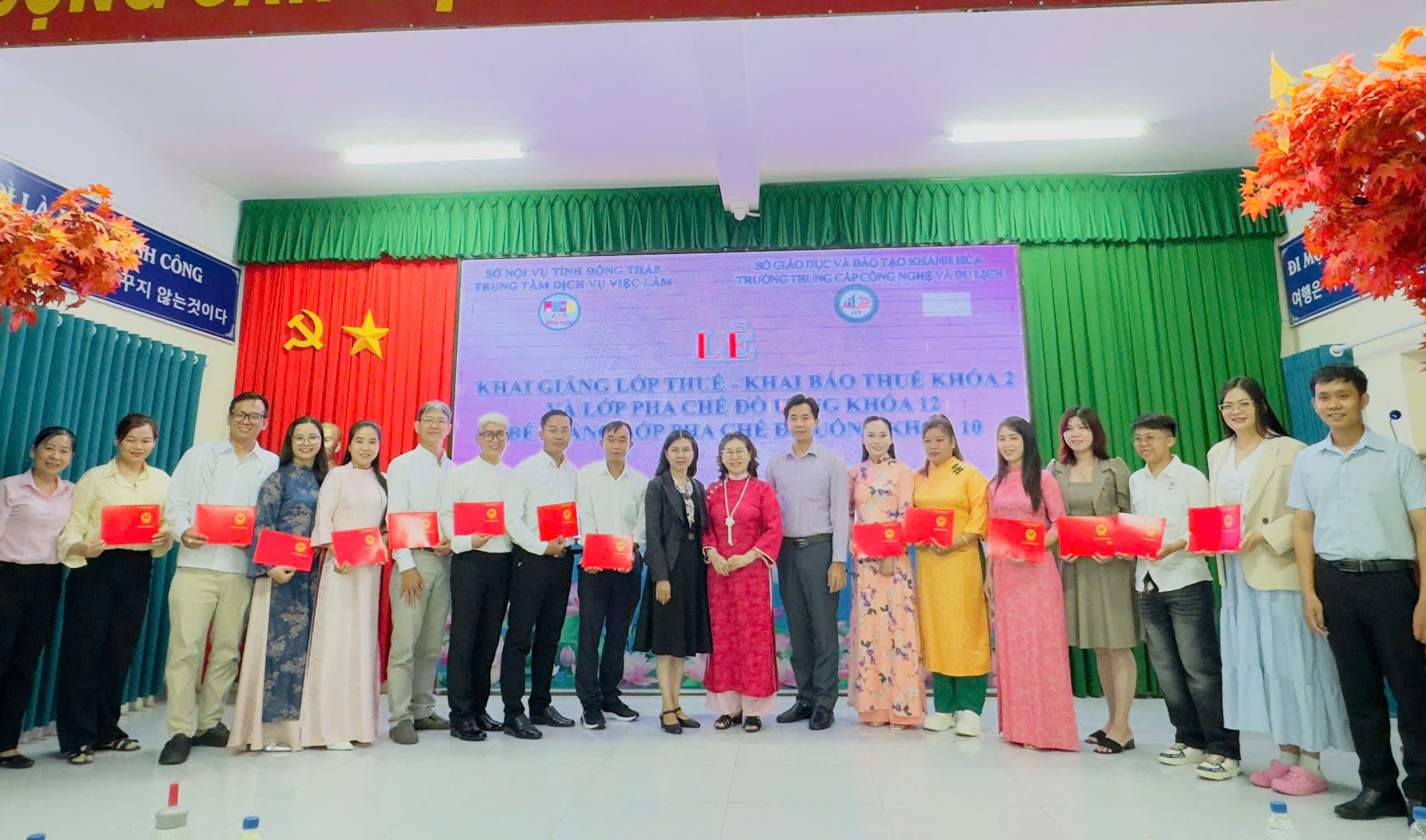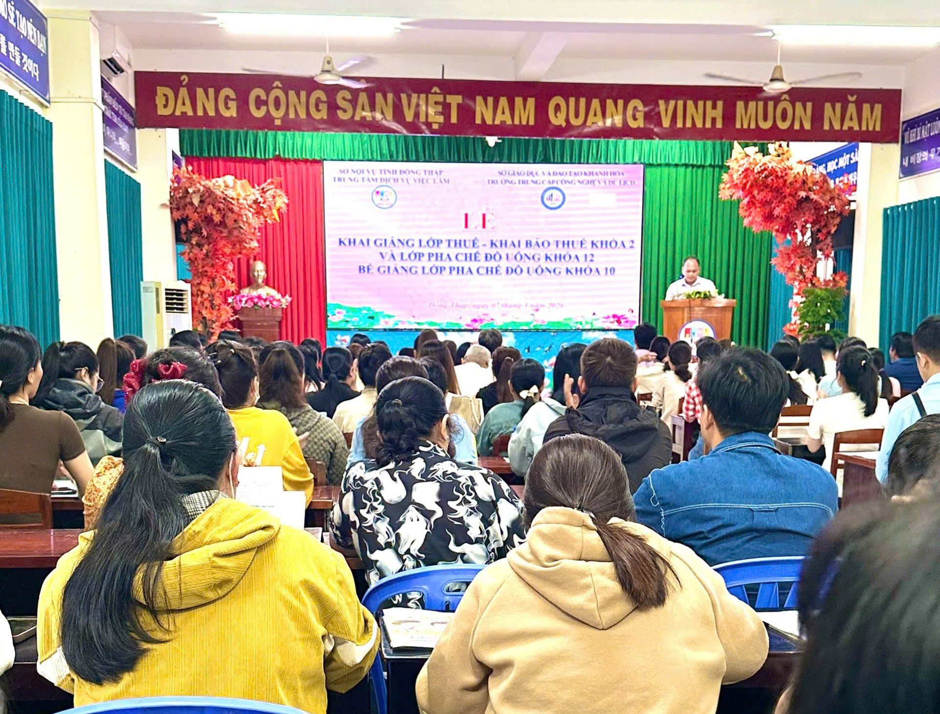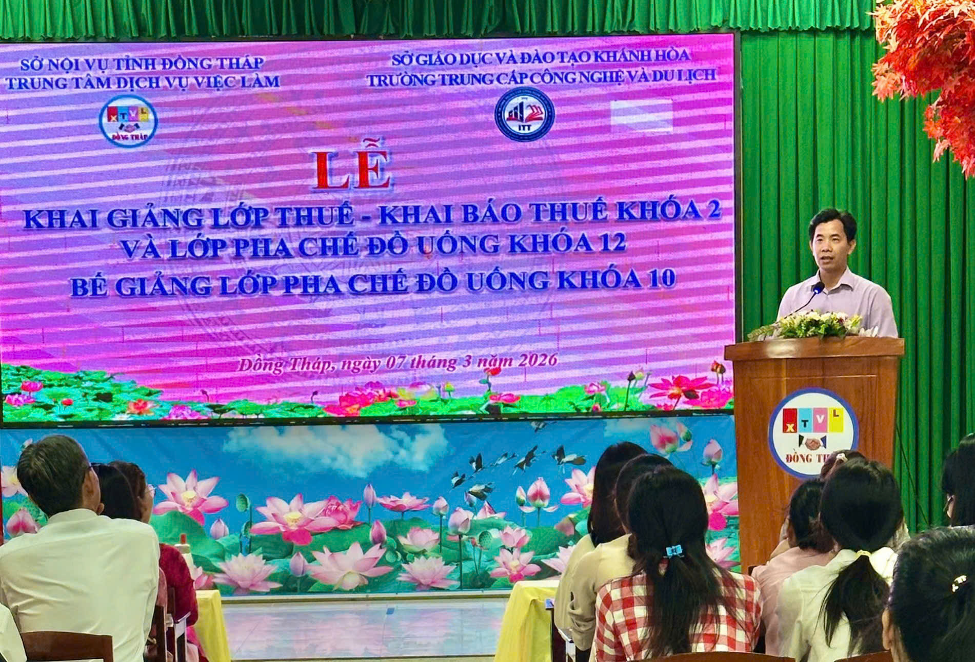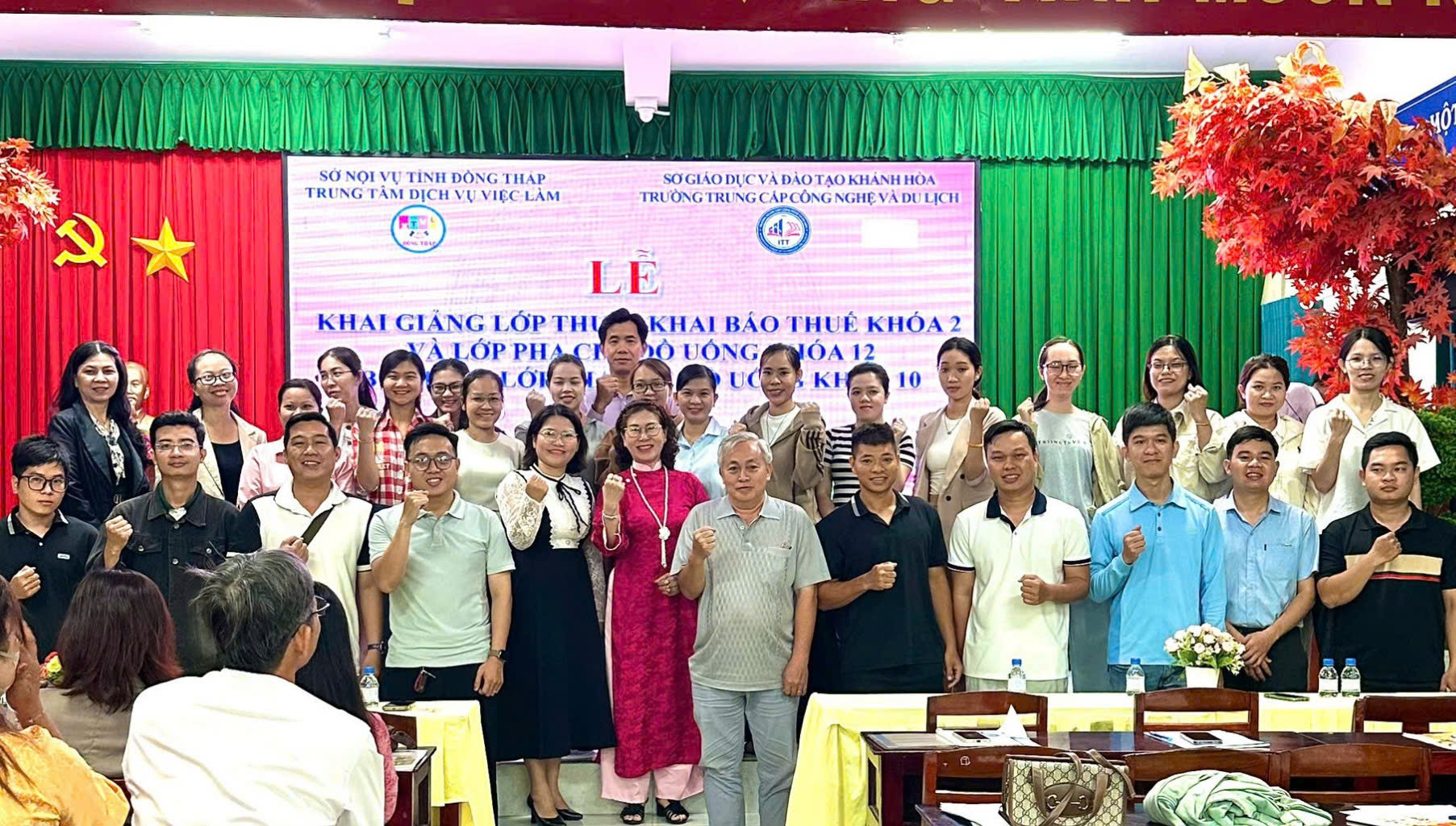 Sáng ngày 07/3/2026, tại Trung tâm Dịch vụ việc làm Đồng Tháp (trụ sở Cao Lãnh), Trung tâm phối hợp Trường Trung cấp Công nghệ và Du lịch tổ chức khai giảng lớp Thuế và khai báo thuế khóa 2, khai giảng lớp Pha chế đồ uống khóa 12 và bế giảng lớp Pha chế đồ uống khóa 10 với tổng số gần 100 học viên tham dự.
