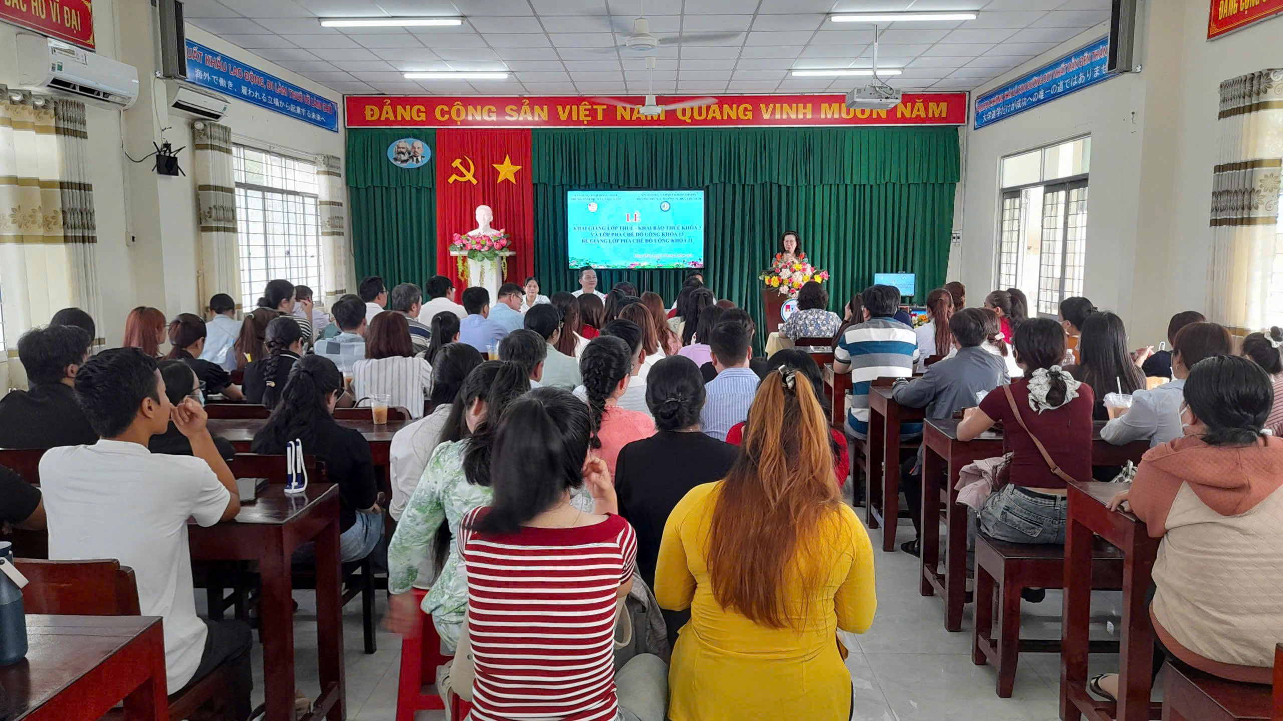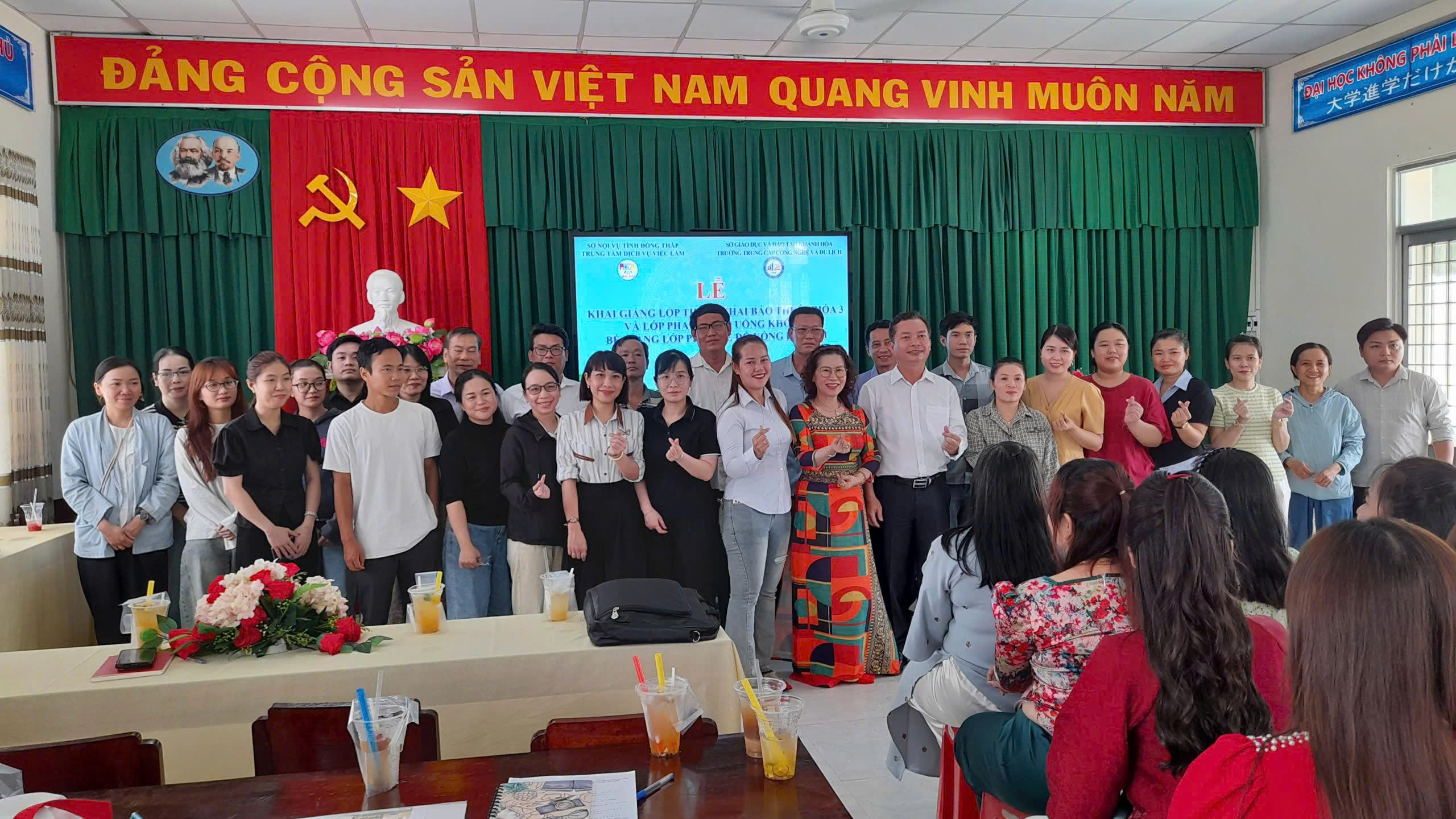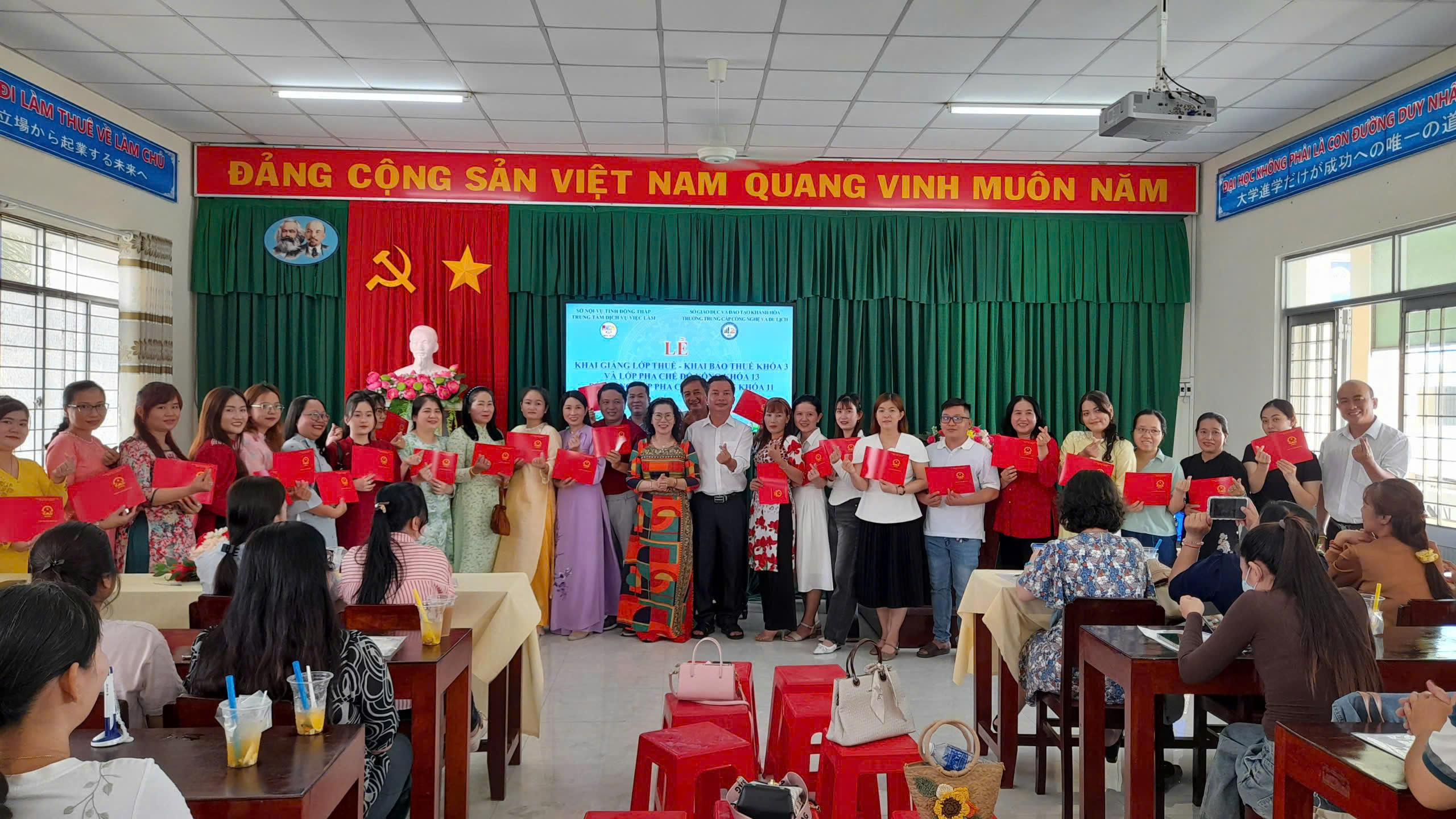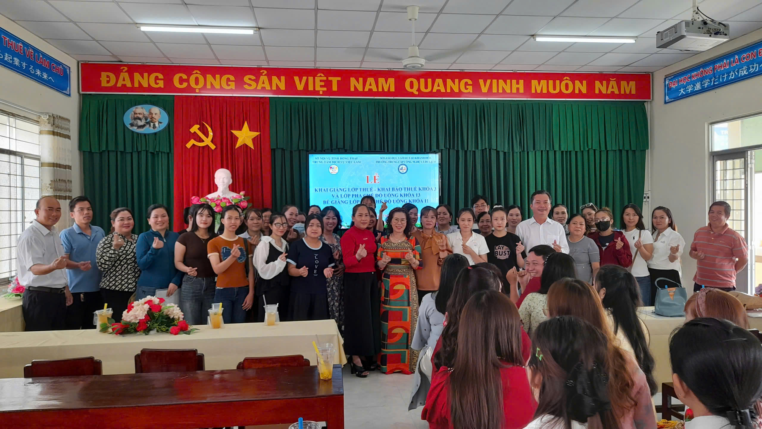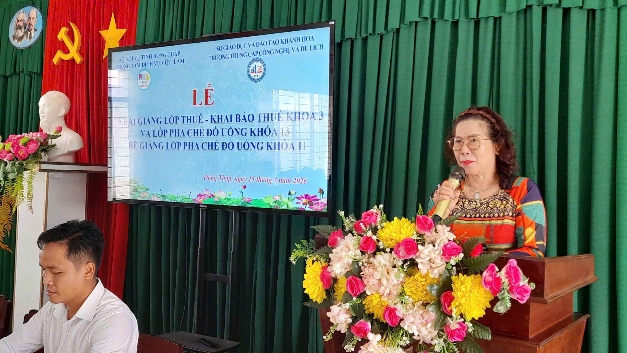 Sáng ngày 15/4/2026, Trung tâm Dịch vụ việc làm Đồng Tháp phối hợp cùng Trường Trung cấp Công nghệ và Du lịch tổ chức lễ khai giảng lớp thuế – khai báo thuế khóa 03 và lớp pha chế đồ uống khóa 13, đồng thời bế giảng lớp pha chế đồ uống khóa 11 với gần 120 học viên tham gia. Buổi lễ được tổ chức trang trọng tại Trung tâm DVVL Đồng Tháp trụ sở phường Trung An. Tham dự buổi lễ có đại diện lãnh đạo Trung tâm và nhà trường, đội ngũ giảng viên và viên chức 2 đơn vị.