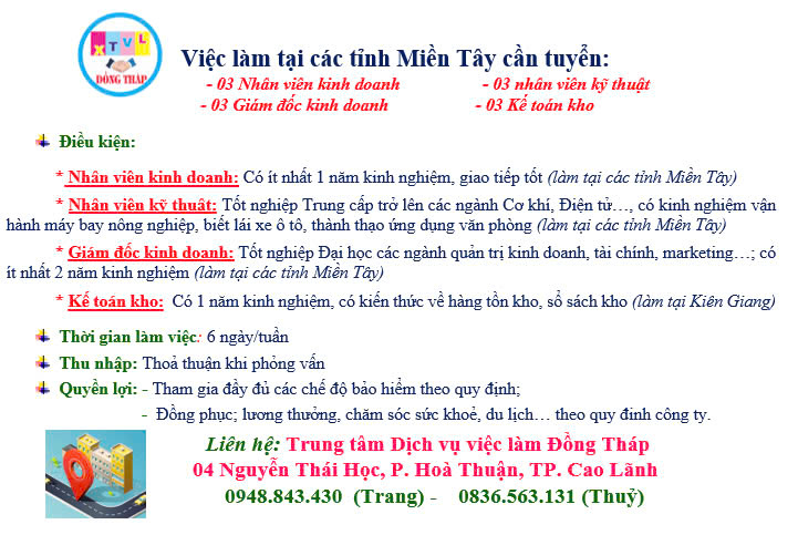 Các tỉnh Miền Tây – Cần tuyển 03 nhân viên kinh doanh, 03 nhân viên kỹ thuật, 03 giám đốc kinh doanh và 3 kế toán kho