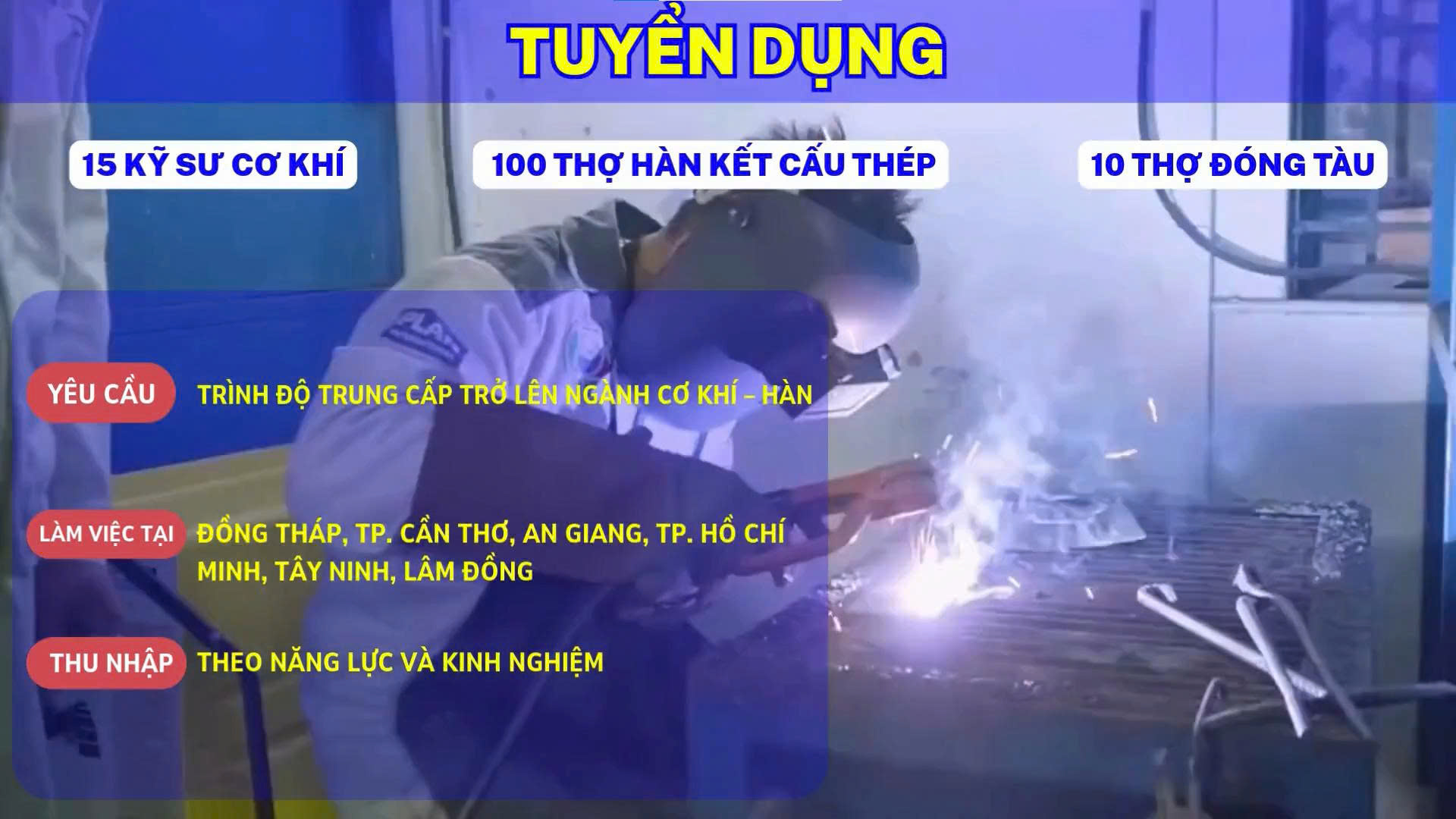 Đồng Tháp, TP. Cần Thơ, An Giang, TP. Hồ Chí Minh, Tây Ninh, Lâm Đồng – Cần tuyển 15 Kỹ sư cơ khí; 100 Thợ hàn kết cấu thép; 10 Thợ đóng tàu