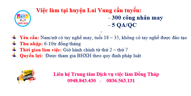 Huyện Lai Vung – Cần tuyển công nhân may và QA/QC