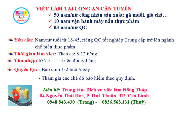 Long An – Cần tuyển 50 công nhân sản xuất (gà muối, giò chả…), 10 nam vận hành máy nấu thực phẩm & 03 QC