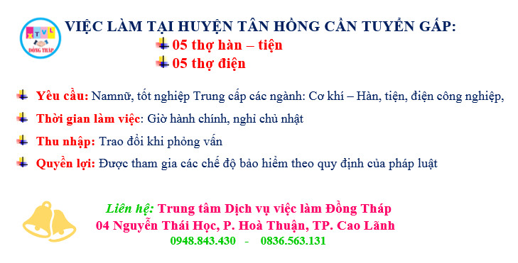Tân Hồng – Cần tuyển thợ hàn-tiện và thợ điện