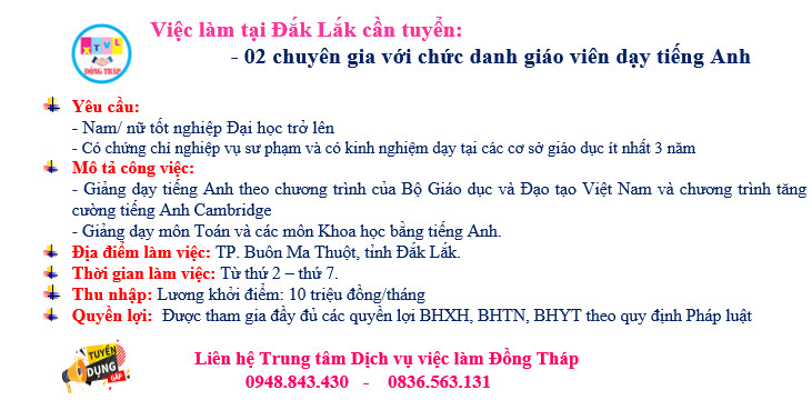 Đắk Lắk – cần tuyển chuyên gia với chức danh giáo viên dạy tiếng Anh