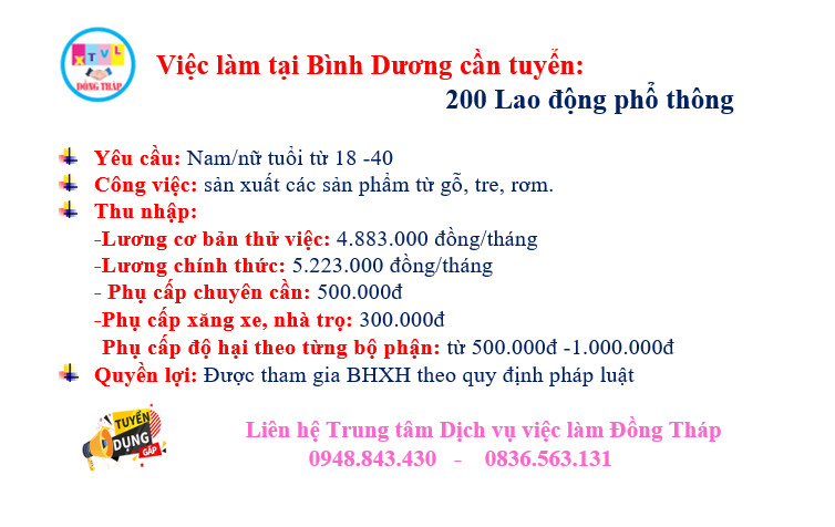 Bình Dương – Cần tuyển 200 lao động phổ thông