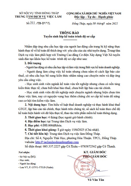 THÔNG BÁO TUYỂN SINH LỚP KẾ TOÁN TRÌNH ĐỘ SƠ CẤP