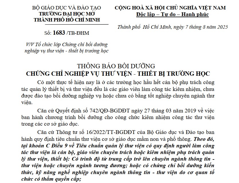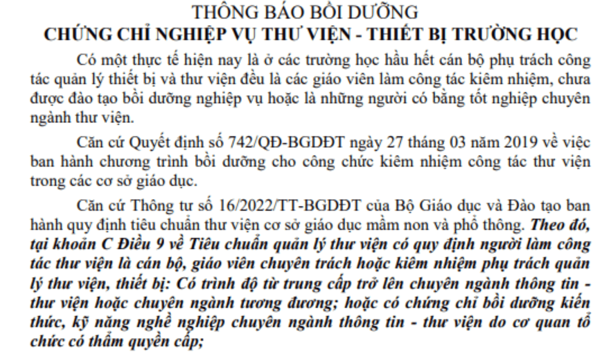 THÔNG BÁO BỒI DƯỠNG CHỨNG CHỈ NGHIỆP VỤ THƯ VIỆN – THIẾT BỊ TRƯỜNG HỌC