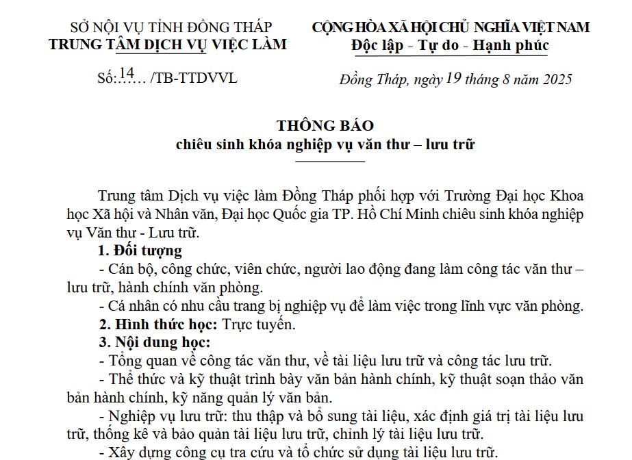 THÔNG BÁO CHIÊU SINH LỚP NGHIỆP VỤ VĂN THƯ – LƯU TRỮ