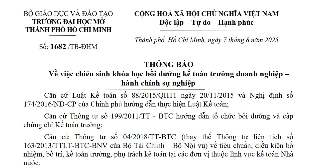 THÔNG BÁO VỀ VIỆC CHIÊU SINH KHÓA HỌC BỒI DƯỠNG KẾ TOÁN TRƯỞNG DOANH NGHIỆP – HÀNH CHÍNH SỰ NGHIỆP